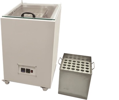 Полностью изготовлен из нержавеющей стали. Он состоит из двух отдельных камер, в каждой по 36 образцов. Имеется специальная система полок из полиамида, позволяющая удерживать образцы в вертикальном положении, не касаясь друг друга. Крышка изготовлена из закаленного стекла с функцией герметизации. Для более удобной транспортировки оснащена колесиками. Он оснащен электронным индикатором уровня воды, который подает сигнал тревоги при низком уровне воды.